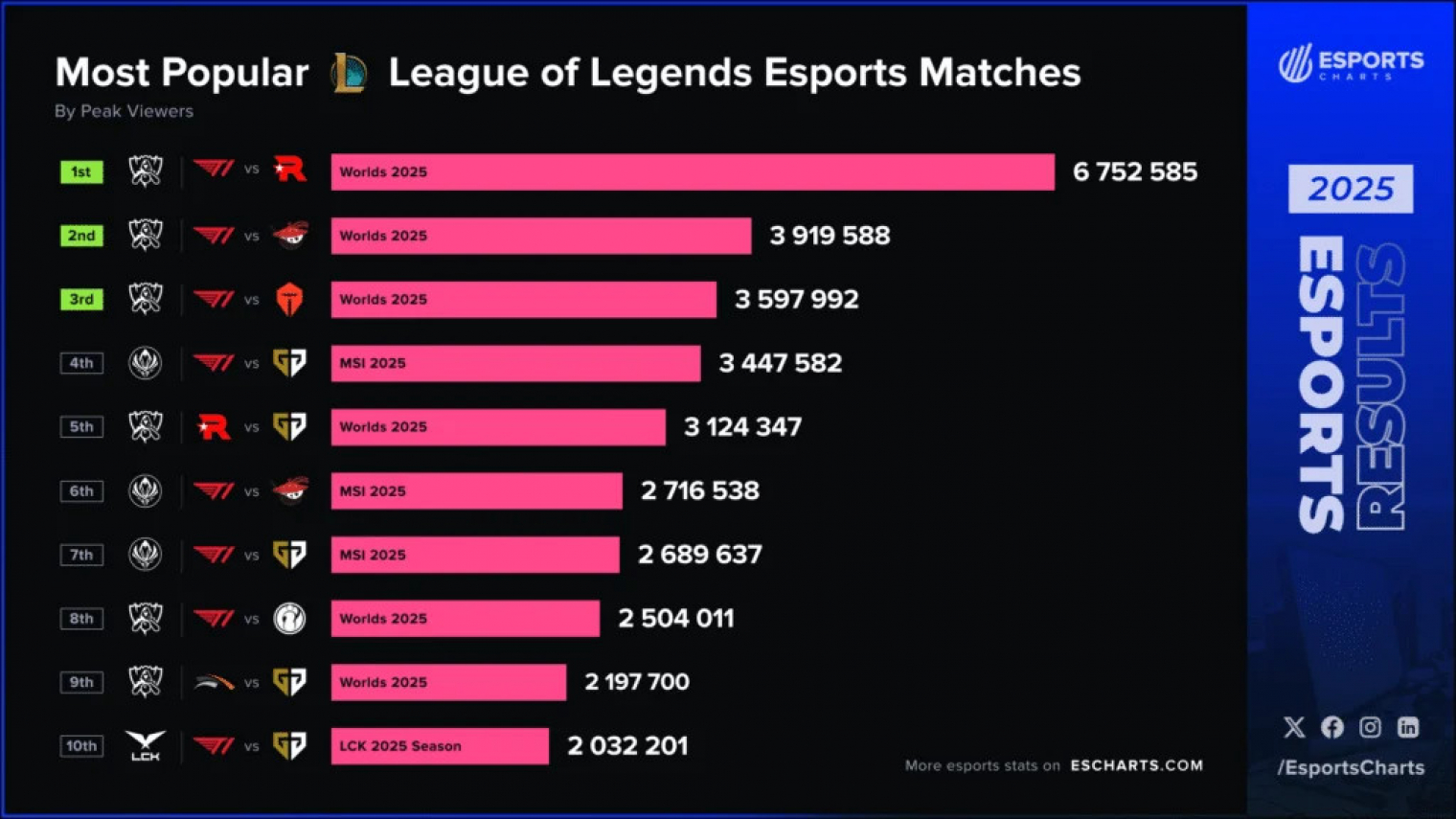 A 2025-ös szezon 10 legnézettebb ütközetéből nyolcban szerepelt a világbajnok, beleértve a listavezető Worlds 2025-ös döntőt is. Ez utóbbit egy ponton egyszerre 6 752 585-en követték, és bár a KT Rolster sajnos nem bizonyult kifejezetten kemény ellenfélnek, ennek láthatóan nem volt hatása a tömeg lelkesedésére.