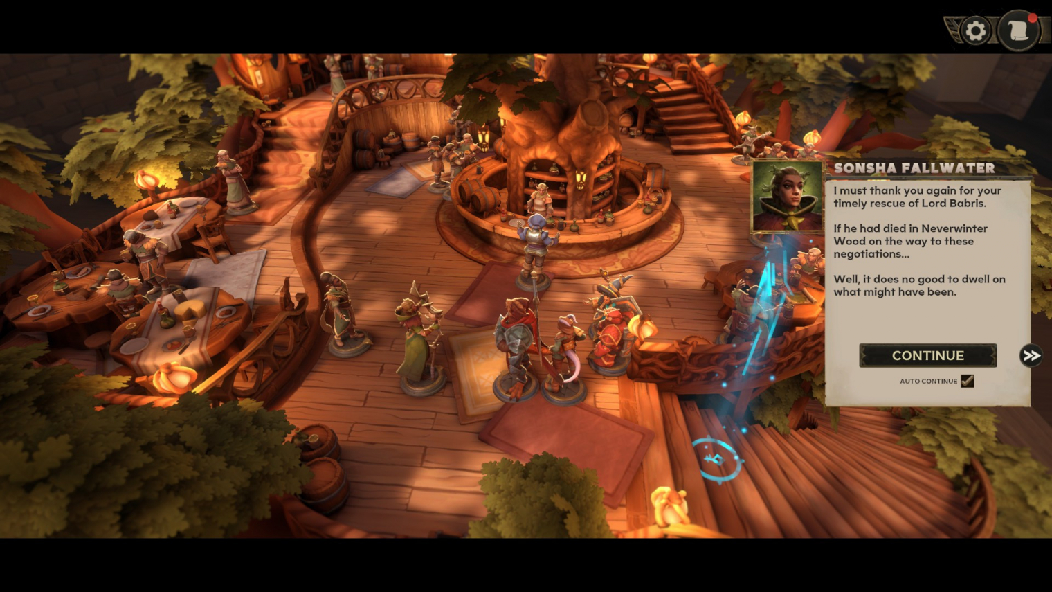 A játék ugyanakkor strukturálisan nem hagy túl sok teret a történetmesélésnek. Van mindkét kampánynak egy-egy központi fogadója, ahová visszajárunk csaták között, iszogatunk, NPC-kkel beszélgetünk és mellékküldetéseket veszünk fel, de a sztori valójában háttérbe szorul a Battlemarkedban. Alapvetően kevés beleszólásunk van abba, hogy a konfliktusok hogyan zajlanak le, de a D&D világának helyzetéről, a történetek mögötti lore-ról és az NPC-k motivációiról rengeteget megtudhatunk az egyébként nagyon ügyesen előadott párbeszédeknek köszönhetően. Sajnos az átvezetők fényét valamennyire lemarja az, hogy valójában csak "műanyag" figurákat látunk statikusan álldogálni és szökdécselni, de a prezentáció ezen részéért nem tudok haragudni. A D&D asztalnál én még ennyit sem tudok felmutatni, miközben három NPC személyiségét és hangszínét próbálom konzisztensen előhozni magamból 4 órányi folyamatos kommentálás után. A valódi gond nem azzal van, hogy hogyan prezentálja magát a Demeo. A valódi gond minden mással van.