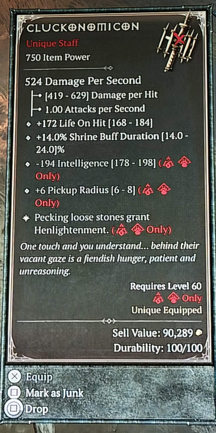 Bemutatkozott Chik'han, The Fowl Beast, aki egy hatalmas bestia egyedi loottal. Amikor azt mondjuk, hogy "egyedi", azt úgy is értjük, mert a Cluckonomicon, az Eggcecutioner és a többi csak ellene lesz hasznos, lévén ezek a tárgyak a "poultry" elleni sebzést tolják fel. És véletlenszerű kotkodácsolást okoznak.