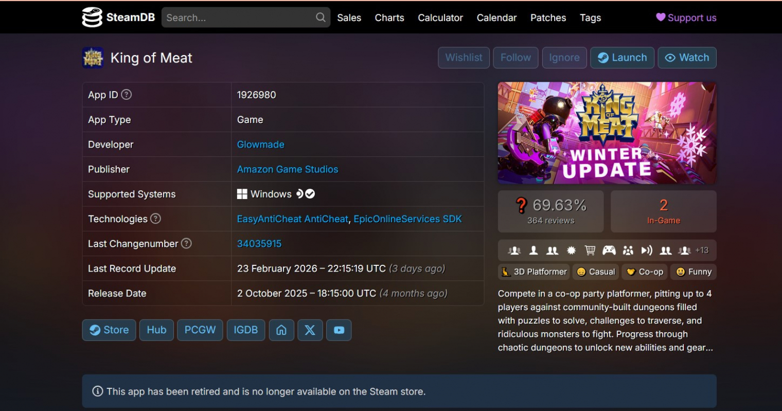 Nem eltagadva a tényt, hogy óriási sikerek is fűződnek a live service játékokhoz, egyre csak bővül a rövid idő alatt a feledés homályába merülő projektek listája. A legújabb áldozat az Amazon Game Studios és a Glowmade kooperatív online dungeon crawler/partijátéka, a King of Meat, amely cirka hat hónappal a megjelenése után végleg bezárja kapuit.