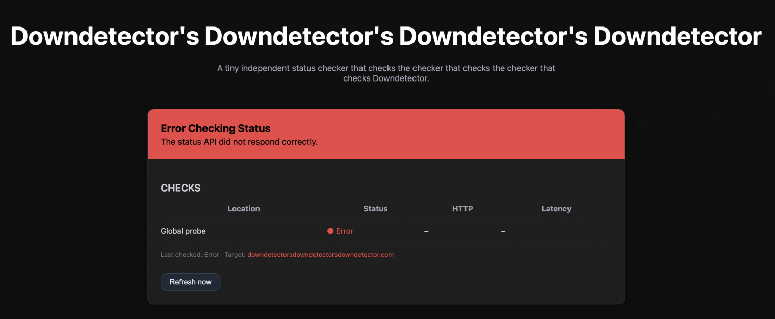 Az irónia hatalmas rajongóiként nagyon viccesnek találjuk, hogy a Downdetector sem elérhető, viszont a Downdetector Downdetectorának a Downdetectora szerint az is leállt.