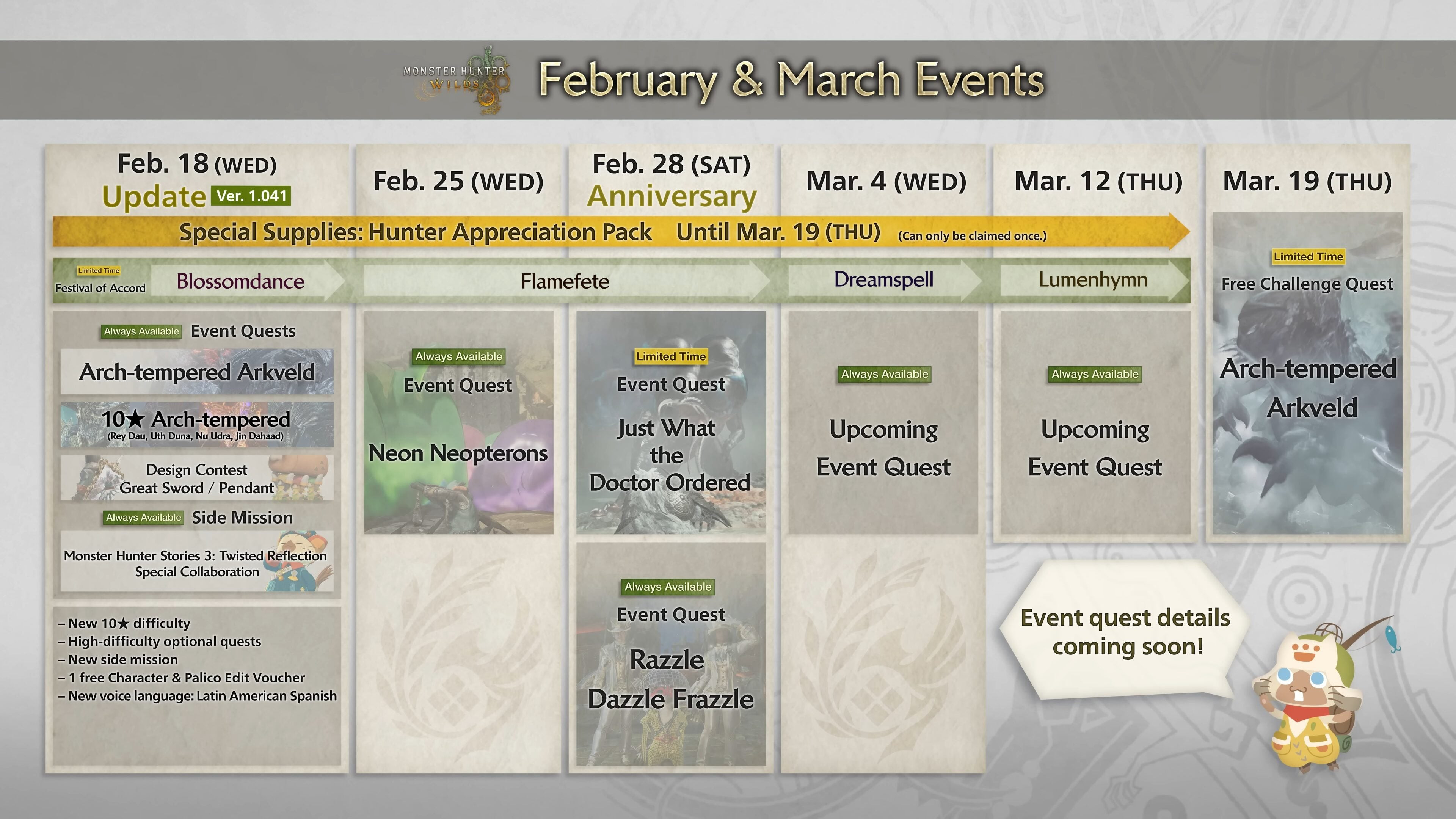 Emellett kapni fogunk új Event Questeket és Arch-tempered szörnyeket. A korábbi bossok jelentősen felturbózott változataiból 10 csillagos variánsokat kapunk, és azokkal együtt Arch-tempered Arkveld is leszáll, hogy elpusztítson mindenkit. Érkezik továbbá egy Monster Hunter Stories 3 kollaborációs sztoriszál, hogy felkészíthessen minket a spin-off márciusi megjelenésére.