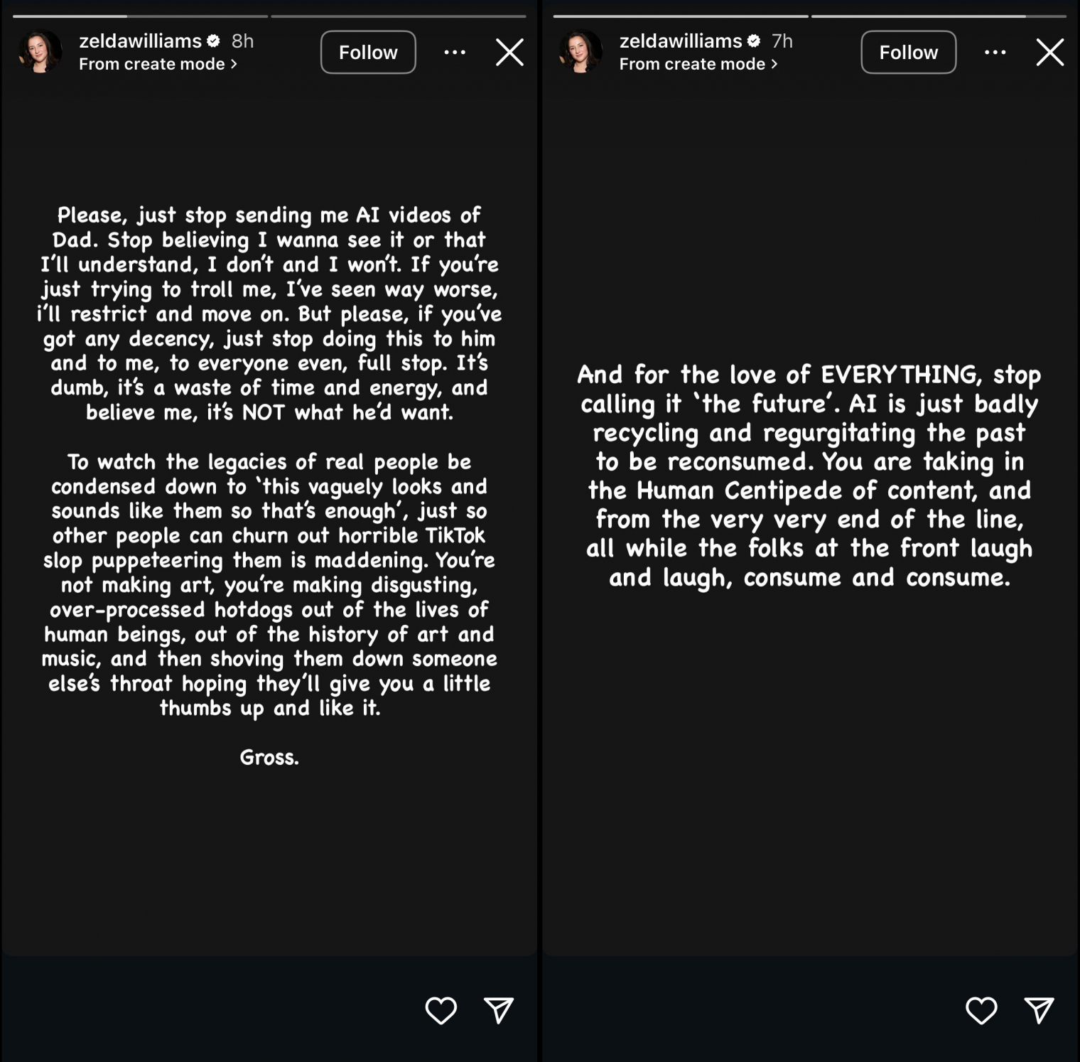 "Kérlek, hagyjátok abba, hogy AI-videókat küldtök apámról. Ne higgyétek, hogy látni akarom, vagy hogy megértem - nem akarom, és nem is fogom megérteni. Ha csak trollkodni akartok, láttam már rosszabbat, letiltalak és továbblépek. De ha van bennetek egy csepp tisztesség is, hagyjátok ezt abba - neki sem tetszene, és nekem sem. Ez ostobaság, időpazarlás, és egyáltalán nem művészet."