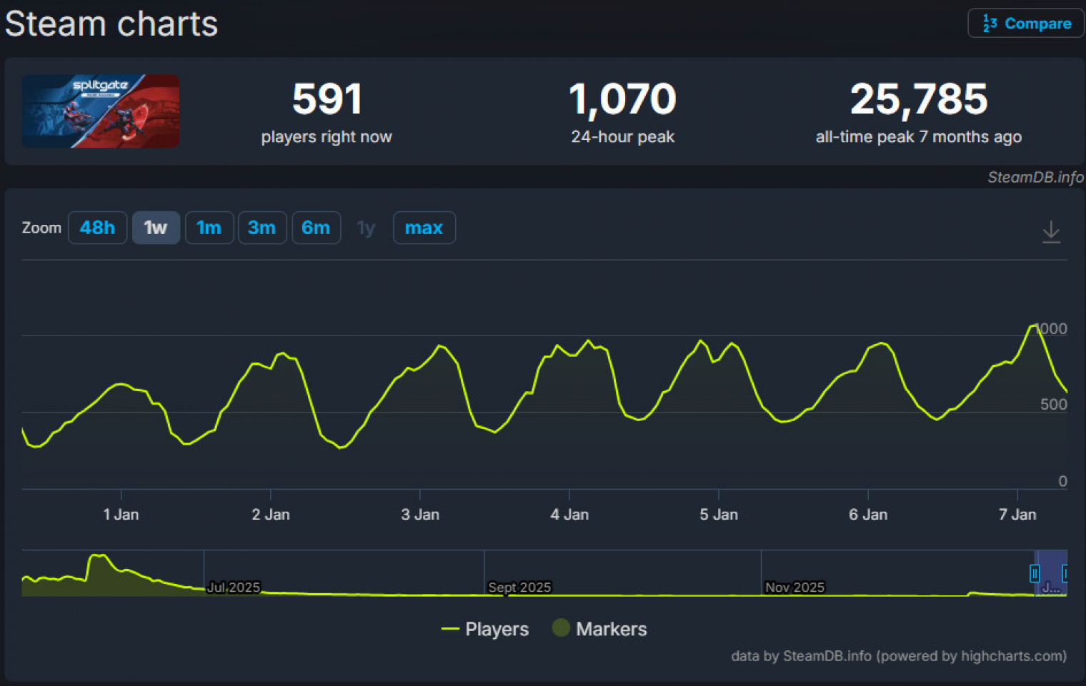 A sci-fi lövöldével kapcsolatos közösségi vélemények eleve mínuszból indultak, azokat pedig csak még erőteljesebben rángatják lejjebb a Steamen keresztül látható adatok. A gamer társadalomnak van egy egészségtelen fixációja a SteamDB kapcsán, ennek hatása pedig a Splitgate 2 (amit egyébként Splitgate: Arena Reloaded címen indítottak újra) esetében kifejezetten erősnek bizonyult.