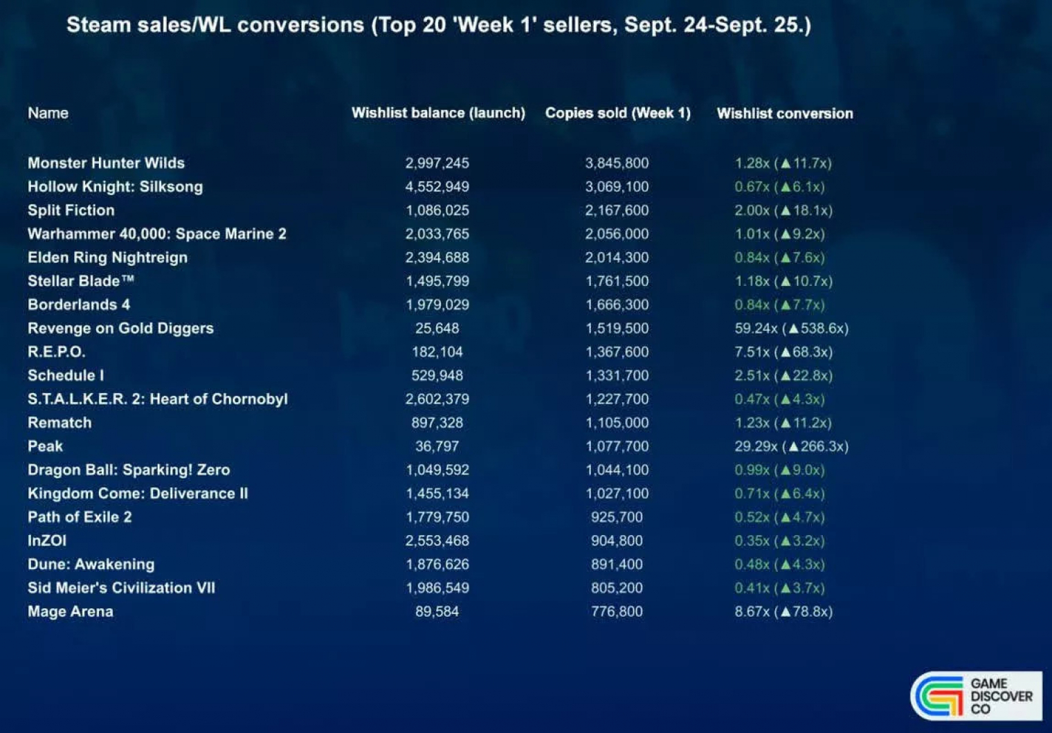 Az olyan játékok melyeknek relatíve magas volt a kívánságlista / tényleges eladás értéke, általában hatalmas felhajtással érkeztek. A Monster Hunter Wilds például majd' 100 százalékos értéket mutatott, de még az olyan sűrűn érkező sportjátékoknál, mint az NBA 2K26 vagy az EA Sports FC 25 is 40 százalék fölött volt az arány. Mindeközben a legnépszerűbb megjelenéseknél hatalmasak az eltérések. A Peak például 1 millió példányban fogyott, miközben csak 36 797-en tették azt a listájukra, szóval az átfordulási arány közel 3000 százalék. A legnagyobb arányt idén egyébként a Revenge on Gold Diggers nevű FMV randijáték produkálta.