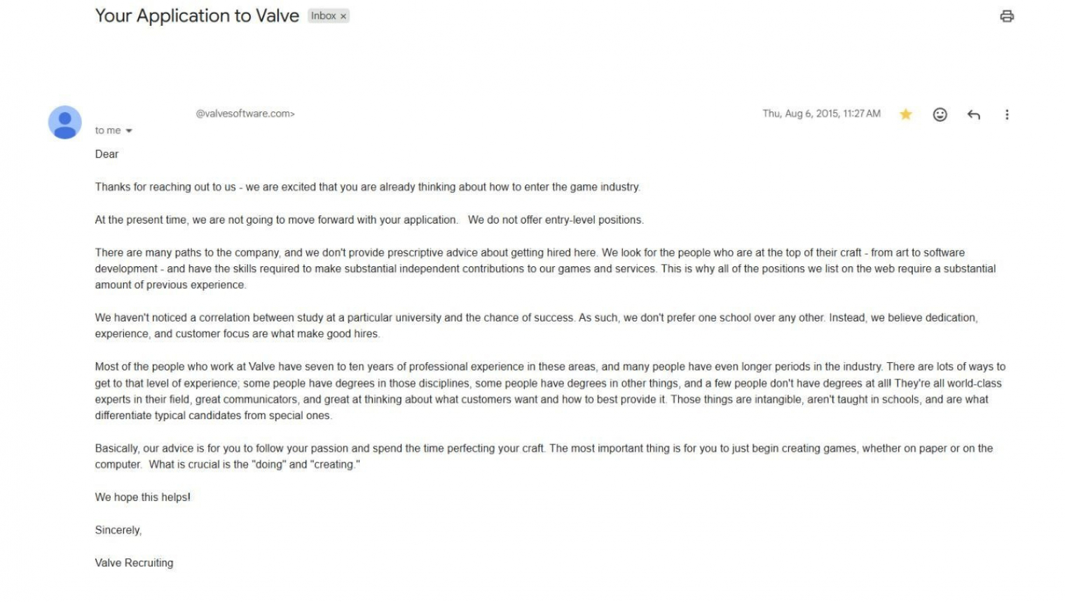 Egy fiatal pályakezdő fejlesztő, Liem Nguyen története járja be a közösségi médiát, miután megosztotta azt az elutasító e-mailt, amelyet 2015-ben kapott a Valve-tól. Nguyen frissen végzett középiskolásként, nehéz anyagi körülmények között próbált munkát találni a játékiparban, és számos cégnek elküldte az önéletrajzát - egyebek között a Steamet és több világhírű játékot jegyző Valve-nak is, válaszra azonban alig számított. Bár jelentkezését elutasították, a cég egyik munkatársa személyre szóló indoklást és tanácsokat is mellékelt a döntéshez, ami ritkaságszámba megy az iparágban.