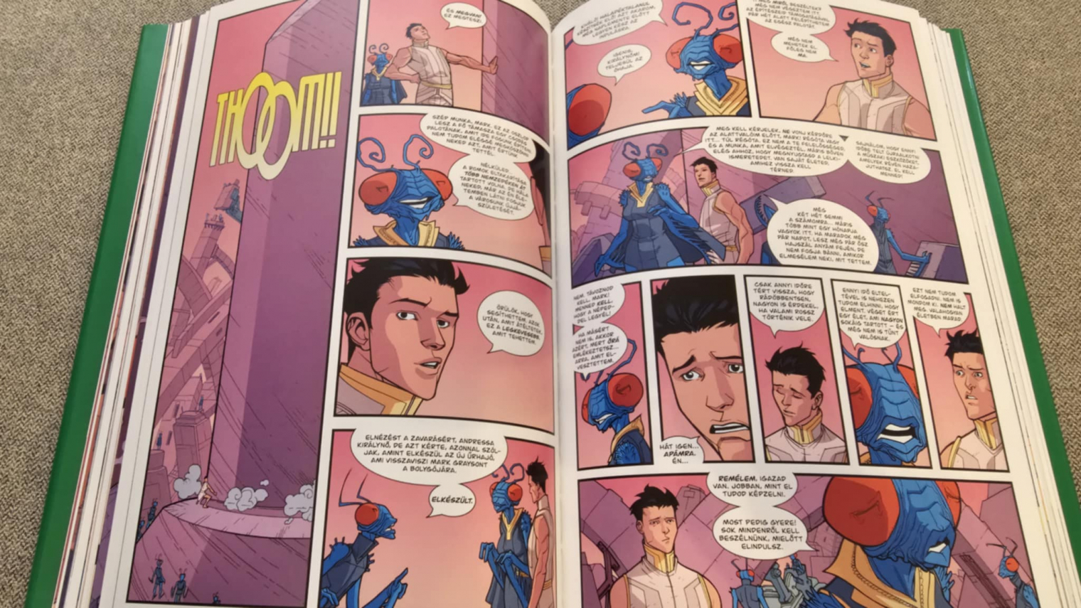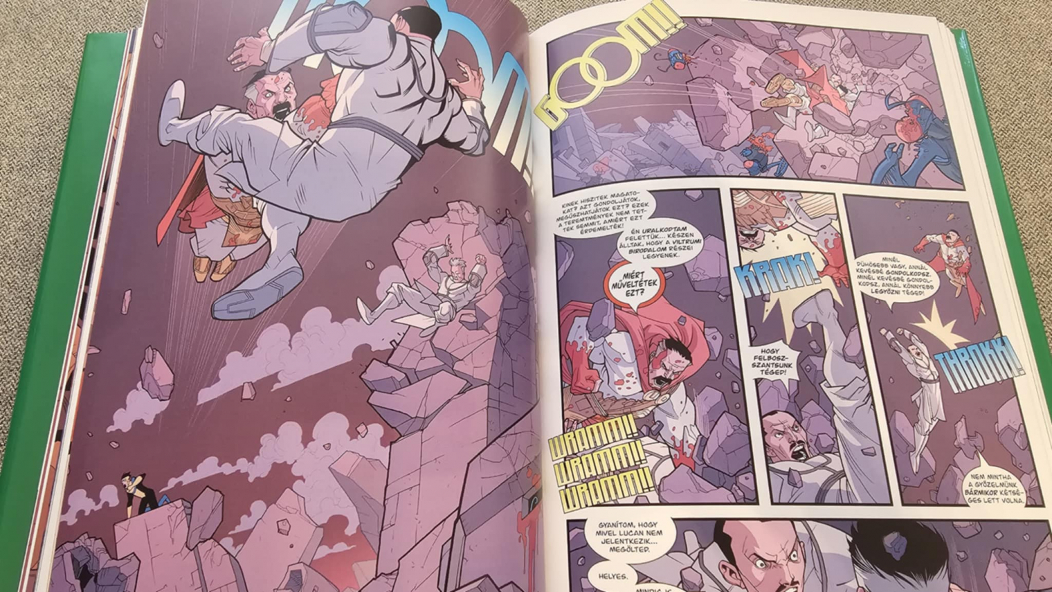 Ryan Ottley rajzai különösen sokat tesznek hozzá ehhez az élményhez. Az akció nyers és sokszor sokkoló, de nem öncélúan, hanem pontosan ott és úgy, ahogy a történet megköveteli. A pusztítás léptéke néha már felfoghatatlan, mégis minden panel követhető, tiszta, érthető. Ottley ráadásul nemcsak a csatákban erős: egy-egy arcon, egy mozdulaton, egy félresikló pillantáson keresztül képes megmutatni Mark mentális állapotát. Az óriási csaták és a csendes, intim jelenetek közti váltások különösen ütnek, mert ettől lesz a történet egyszerre grandiózus és fájdalmasan személyes. Ehhez az Ultimate Collection formátum kifejezetten jól passzol. A nagy méret, a jó papír, az egységes tördelés olyan olvasási élményt ad, ahol a sztori tényleg egyben tud hatni. Ez különösen fontos ennél a kötetnél, mert a szálak folyamatosan egymásba csúsznak, és gyakran csak jóval később derül ki, mit indított el egy korábbi döntés. Ebben a formában az Invincible még inkább érződik sötét sci-fi drámának, mint klasszikus szuperhős-képregénynek.