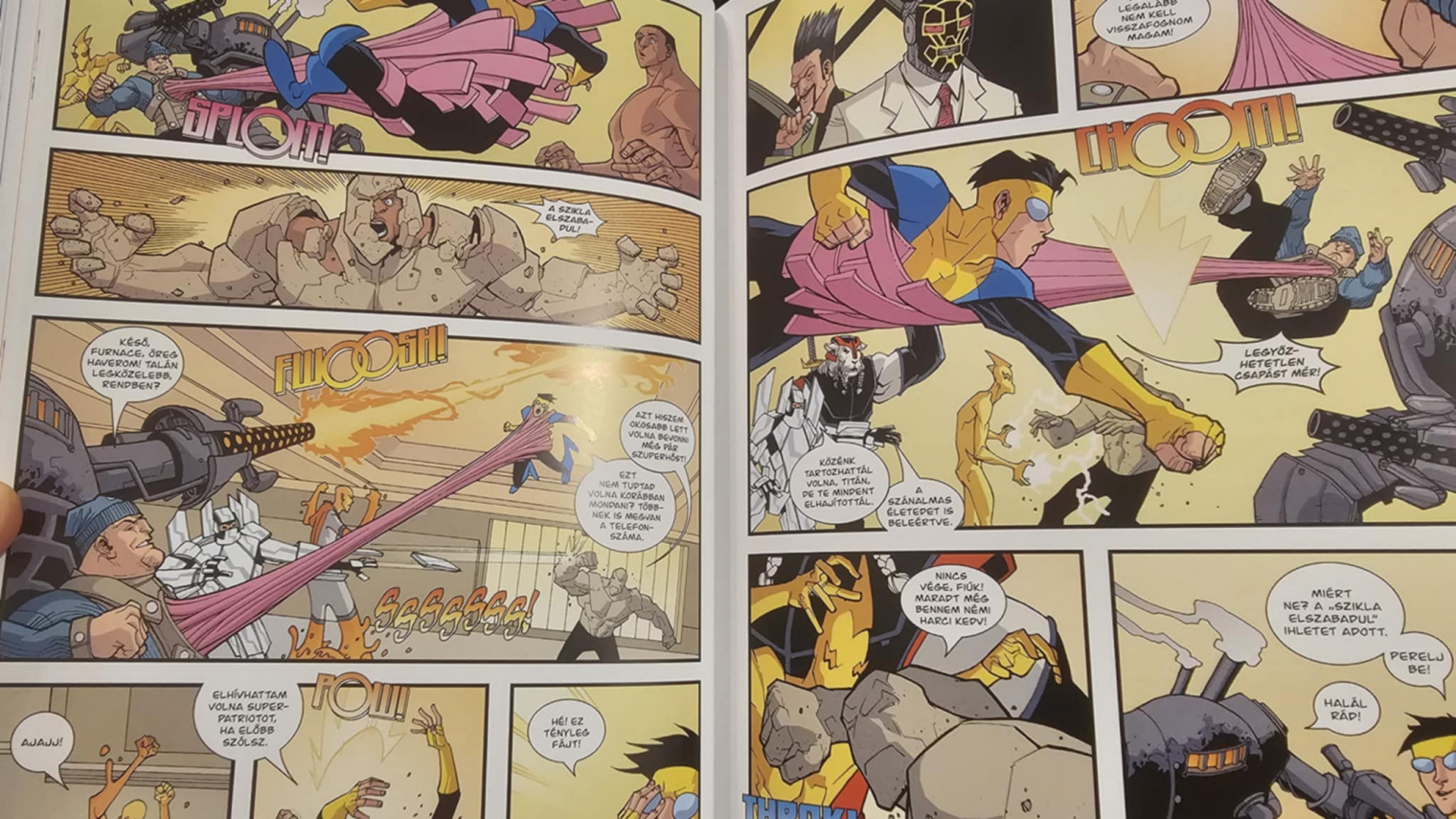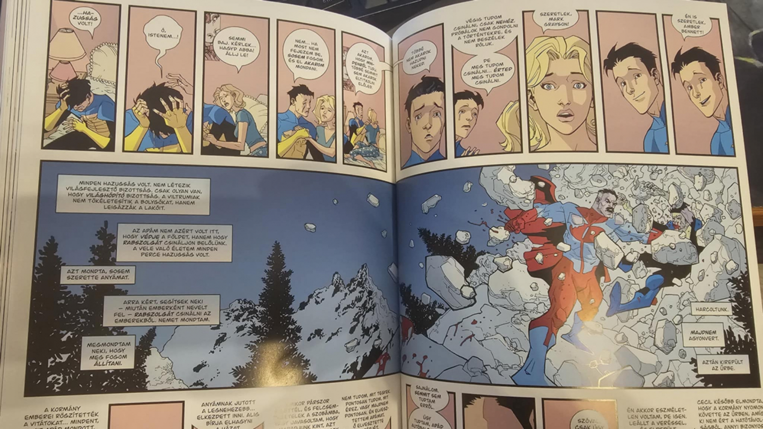 A tévésorozattal való összehasonlításnál különösen izgalmas látni, mennyire más tempót diktál a képregény. (Bocs, de tényleg annyian ismerték meg ezt a karaktert az animációs szériából, hogy lehetetlen nem egymás mellé rakni a két produkciót, ahogy a The Boys esetében is kihagyhatatlan az efféle méricskélés.) A Prime Video animációja több ponton lelassította a cselekményt, hogy a drámai pillanatok nagyobb hangsúlyt kapjanak, és néhány eseményt át is rendezett, hogy még markánsabb érzelmi ívet adjon Mark fejlődésének. A képregény ezzel szemben gyorsabban, direktebben építkezik, és sokszor úgy adagolja az információt, hogy az olvasó egy-egy panel között érzi meg az ütések igazi súlyát. A sorozat előnye a kiforrott párbeszédekben és a színészi hangjáték erejében rejlik, míg a képregény a nyers, vizuális intenzitásban verhetetlen. A kettő együtt adja ki a teljes képet: a sorozat megmutatja a fájdalom arcát, a képregény pedig megmutatja a fájdalom sebességét.