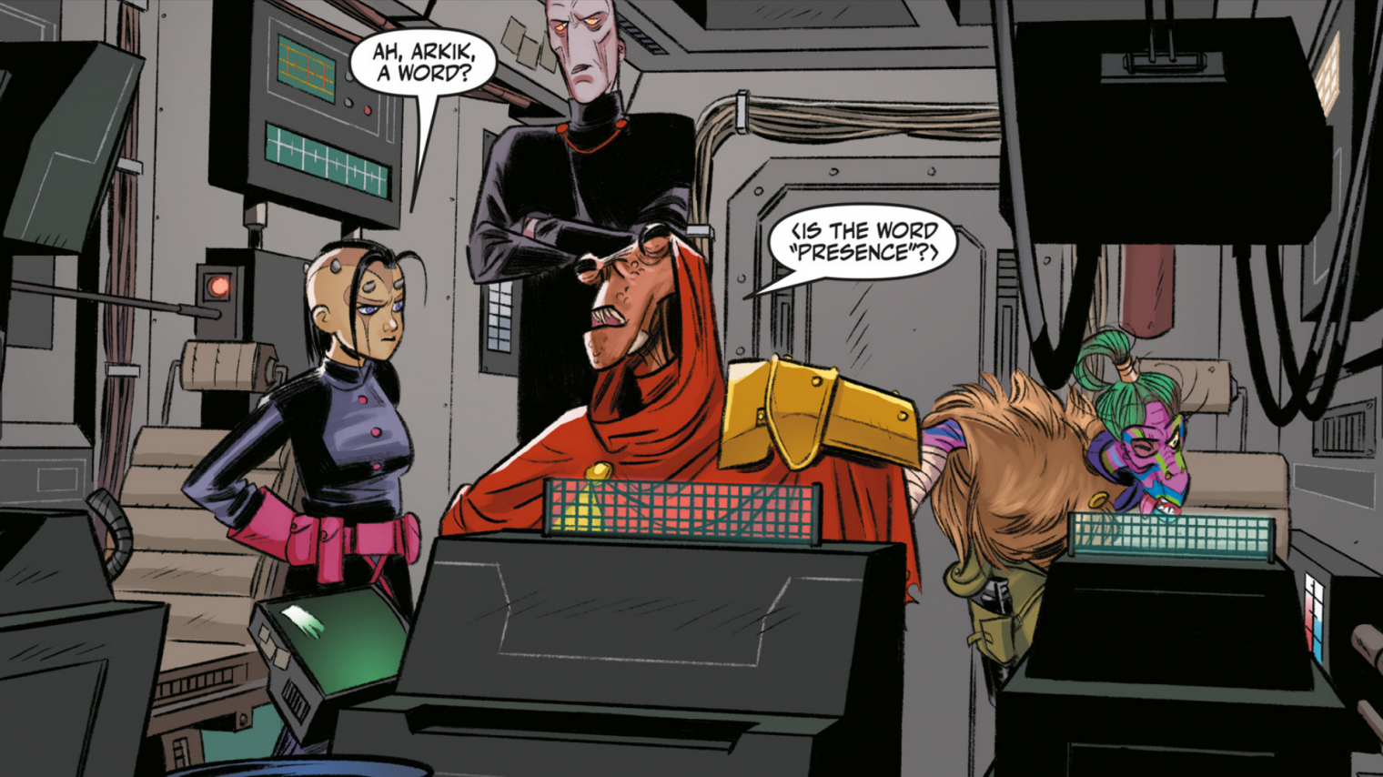 Sav a harcban ugyanakkor nincs egyedül. Egy Maz Kanata kastélyában tengődő, szedett-vedett banditákból álló legénység szegődik mellé, a rendkívül vegyes társaságnak még Dexter Jettster, Obi-Wan Kenobinak A klónok támadásában látható cimborája is a tagja. Dex ekkoriban amolyan peremvidéki kalandor volt, aki azért járta a galaxist, hogy történeteket gyűjtsön. Amellett, hogy ez tökéletesen illik a figura személyiségéhez, és annak is nagyon ügyesen megteremti a hátteret, hogy honnan tudott annyit a Kaminóról, még zseniális bajszot is kapott a képregény lapjain.
