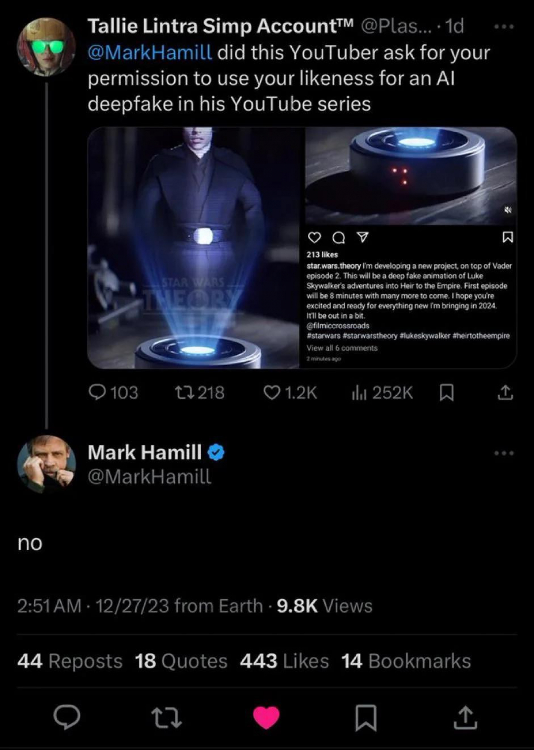 Természetesen a Fandom Menace tagjai is rendszeresen emelték pajzsként maguk elé Mark Hamill véleményét például Az utolsó Jedikről saját igazuk bizonyítására. Amikor viszont Hamill a közösségi médiában kifejezte demokrata politikai nézeteit, hirtelen első számú közellenség vált belőle ezen emberek szemében. Hasonló történt, amikor az egyik leghíresebb, ide köthető tartalomgyártó, Star Wars Theory egy AI-generált fanfilmben Hamill arcát használta, és valaki rákérdezett a színésznél X-en, hogy engedélyt adott-e erre. Hamill erre mindössze annyit válaszolt, hogy "nem", mire a youtuber kirakott egy videót, amiben jobb szó híján elhisztizte, hogy Mark Hamill utálja őt, a rajongóinak egy része pedig a színész ellen fordult. Erre reagálva valaki ismét az X-hez fordult és feltette azt a kérdést Hamillnek, hogy haragszik-e a tartalomgyártóra. Kitalálhatjátok, mi volt erre a színész válasza, de elárulom: "nem".