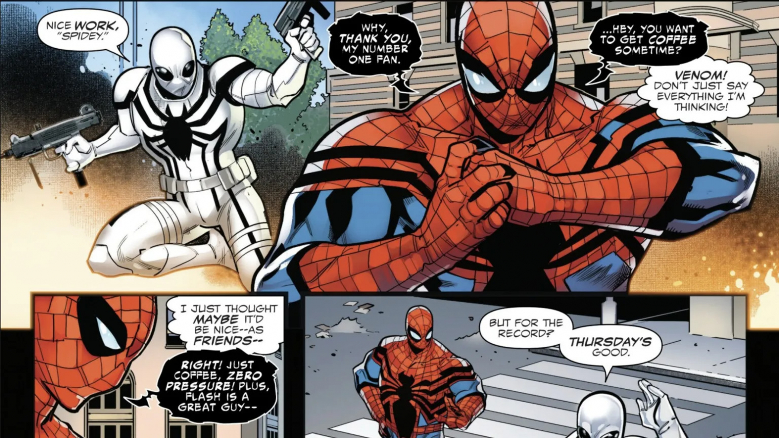 A Venom 252. számában Mary Jane és a szimbiótával alkotott új párosa (igen, jelenleg a Marvel új füzeteiben MJ az új Venom) Flash Thompsonnal és más szövetségesekkel együttműködve próbálja kordában tartani a S.C.A.R. szervezetet, miközben Dylan (az eredeti Venom, vagyis Eddie Brock fia) biztonságát is szem előtt tartják. Flash az elmúlt hónapokban megbízható támaszként jelent meg MJ életében, és a közös harcok során egyre szorosabb kapcsolat alakult ki köztük. A történet legutóbbi fordulata egyértelműen egy romantikus irányba mutat, még ha Mary Jane ezt egyelőre próbálja is bagatellizálni.