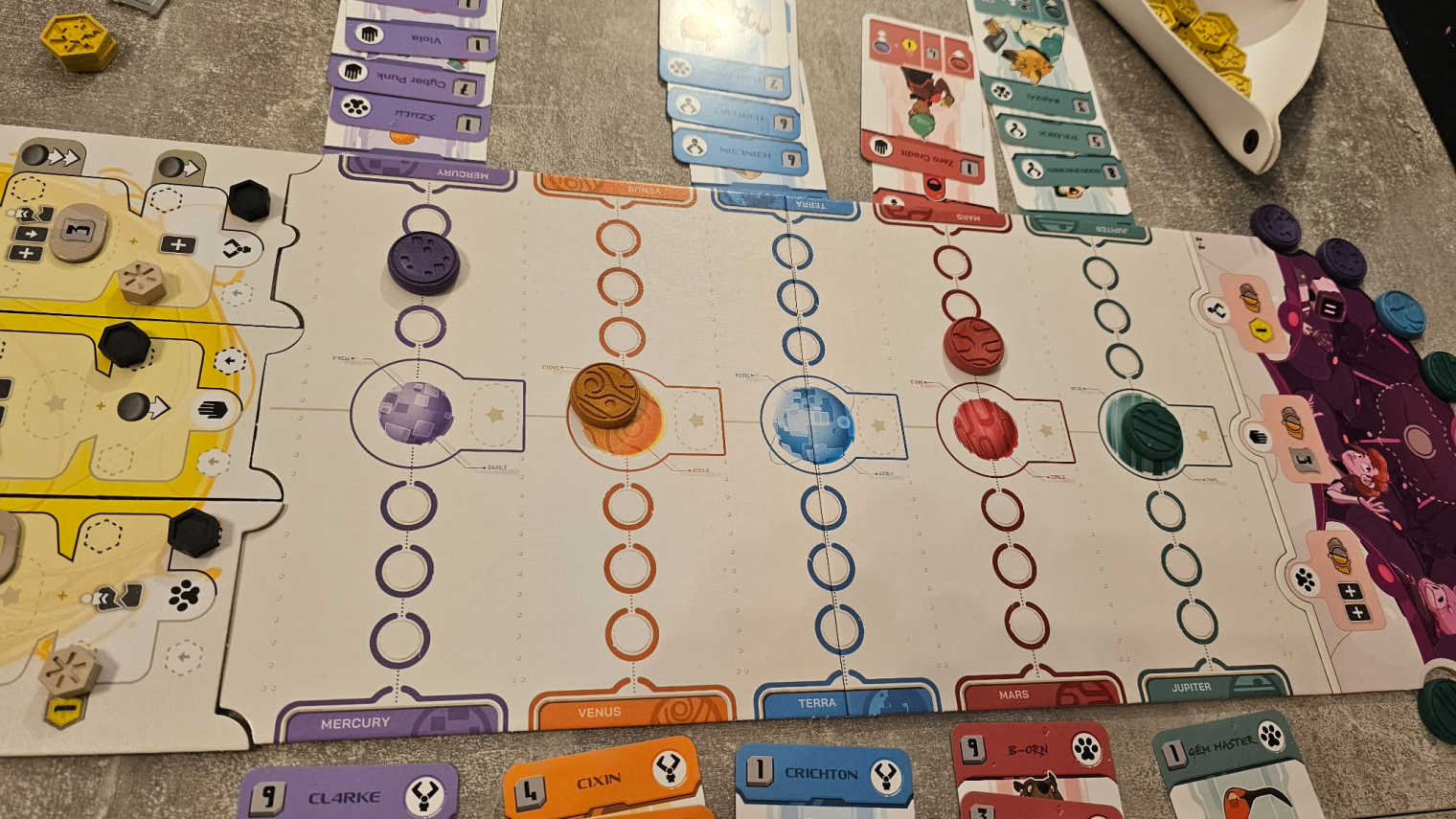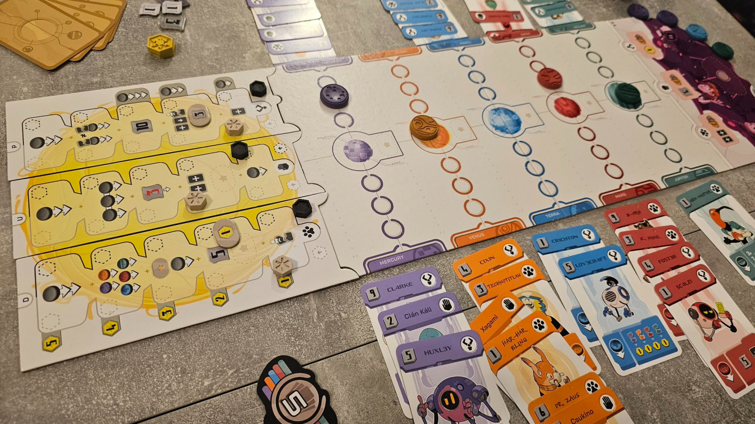 A Zenit azért működik jól, mert kevés mozgásteret ad. Kreditből fizetünk, zenítiumból fejlesztünk, és közben az ellenfél ugyanazokért a lehetőségekért harcol. Ha túl sokáig várunk, a másik játékos könnyen előnybe kerül. Ha csak védekezünk, elveszíthetjük a kezdeményezést. A jó parti végig arról szól, hogy mikor kell támadni, mikor kell visszavenni, és mikor kell inkább egy másik bolygóra váltani. A Zenit nem sima kártyajáték néhány plusz elemmel, hanem táblás-kártyás hibrid. Lapul a dobozban egy Naprendszer-tábla, technológia-táblák, szenátustábla, ügynökkártyák, erőforrás-jelölők és bónuszlapkák. Mindez elsőre soknak hangozhat, de a játék közben jól átlátható marad.