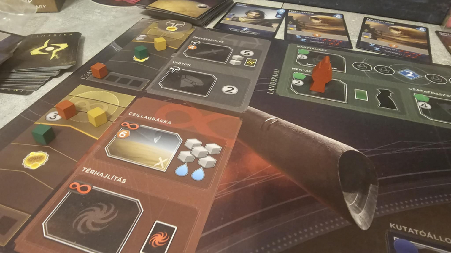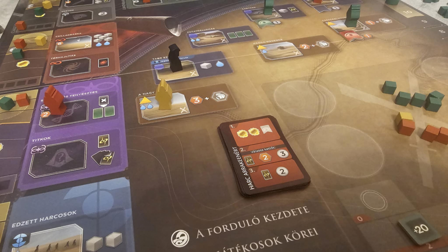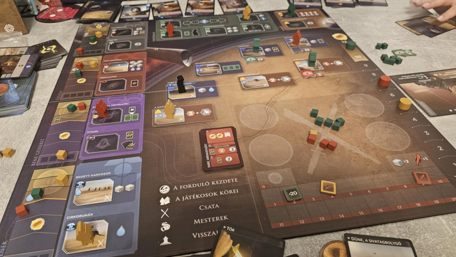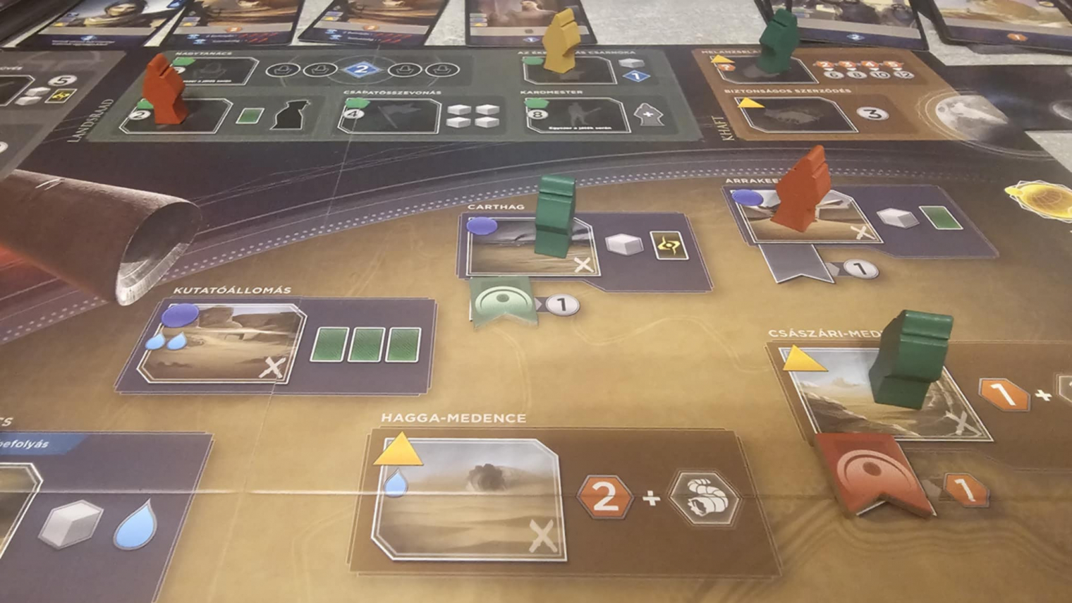 A pakliépítés finoman, de határozottan formálja a játék menetét. A kezdeti lapok egyszerűek és mondanunk sem kell, meglehetősen korlátozottak, de ahogy haladsz előre, egyre erősebb és specifikusabb kártyákat vásárolhatsz. Ezek nemcsak több erőforrást vagy jobb akciókat adnak, hanem meghatározzák a játékstílusodat is. Egy rosszul megválasztott lap hosszú távon visszaüthet (elég nehéz a pakliból "törölni", vagyis végleg eldobatni egy lapot), egy jól időzített vásárlás viszont egész stratégiákat nyithat meg. A Dűne: Impérium nem engedi meg a kapkodást, szóval ha a játékospajtásaid hamar triggerelődnek a hosszú gondolkodástól, akkor bizony itt bőven lesz baj.
