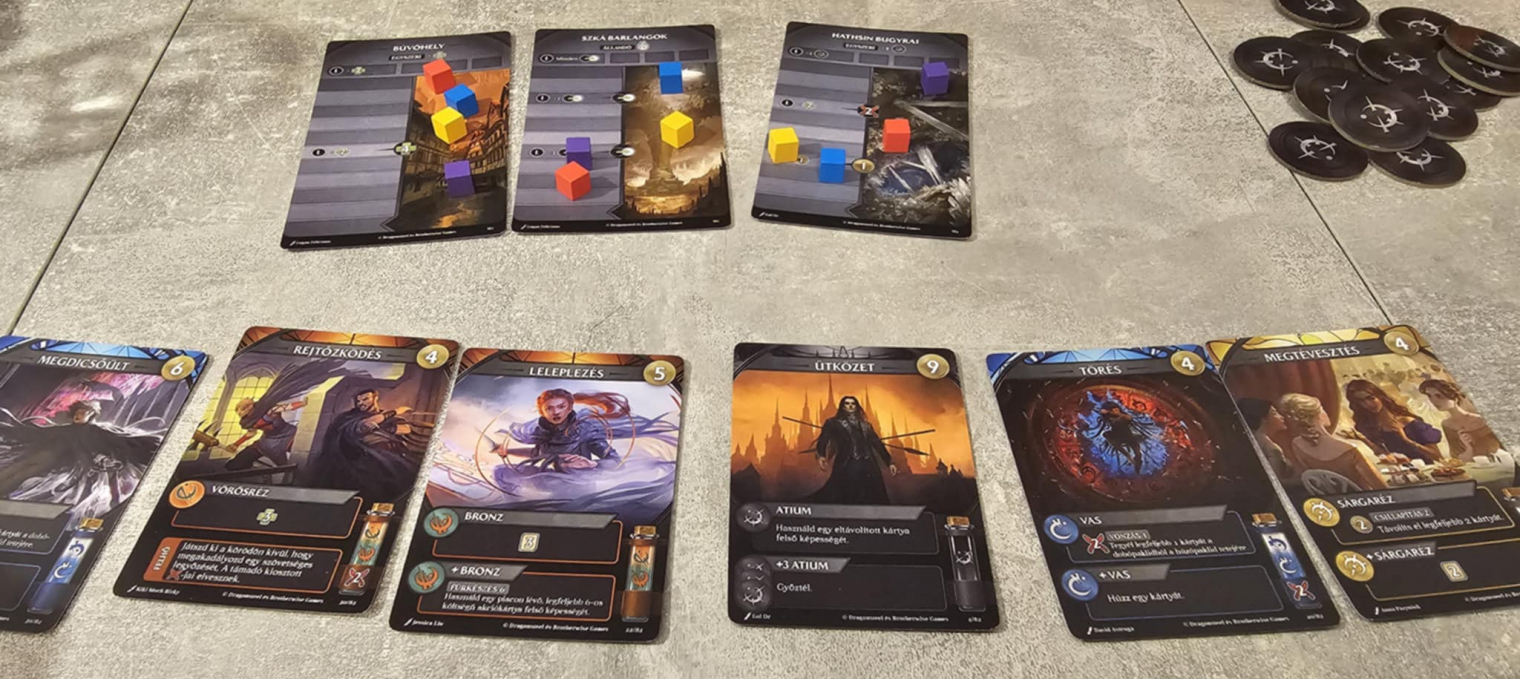 Tematikusan a játék kifejezetten erős. A regények ismerete nem kötelező, de sokat hozzáad az élményhez. A karakterek, a helyszínek és a fémmágia rendszere mind-mind azt az érzést keltik, hogy valóban Luthadel utcáin mozogsz, és hogy minden döntésednek súlya van a világon belül. Ugyanakkor a játék önállóan is működik, mert a mechanikák elég világosan közvetítik, mi miért történik, és hogyan illeszkedik a rendszer egészébe. Sokféle fém áll a rendelkezésedre, ezek "elégetésével" tudod kijátszani a kártyákat, de amikor már több lapot is megszerzel, ezeket is használhatod az akciókártyák költségének megfizetésére. Karaktered kiképzésszintjének függvényében megvan, egy körben mennyi fémet égethetsz, de lehetőség van további varázsfémek "fellobbantására" is, ekkor viszont az adott fémet később frissítened kell, hogy újra használni tudd. Okosan összekalapált rendszer ez, ami temérdek kombólehetőséget rejt magában.