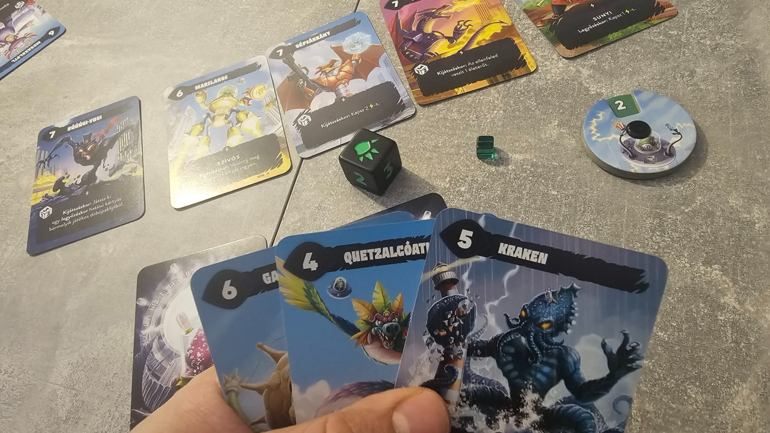 És ettől lesz a Mindbug x Tokió királya egyszerre vonzóbb és egy hajszállal kevésbé elegáns, mint az Első találkozás. Vonzóbb, mert a Tokió királya szörnyei, az energiakockák és a dobások azonnal rátesznek még egy réteg látványos káoszt az alapokra. Már nem csak azon izgulsz, hogy ellopják-e a bestiádat, hanem azon is, hogy mikor jön ki egy jó dobás, mikor érdemes energiát gyűjteni, és melyik erőkártya boríthatja meg leginkább az állást. Ez a verzió hangosabb, direktebb és valamivel filmszerűbb, jobban rájátszik arra az örömre, amit a Tokió királya amúgy is tud: óriásszörnyek egymásnak mennek, az asztalon meg percek alatt elszabadul a káosz. Ugyanakkor épp emiatt picit távolabb is kerül attól a pengeélen táncoló tisztaságtól, ami az Első találkozást annyira erőssé tette. Itt több a külső inger, több a kis mini-jutalom, több a harsány csinnadratta, és ez sokaknak pont jobb lesz, másoknak viszont már egy fokkal kevésbé feszes.