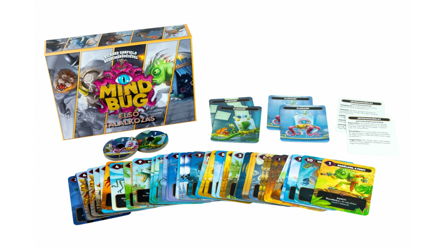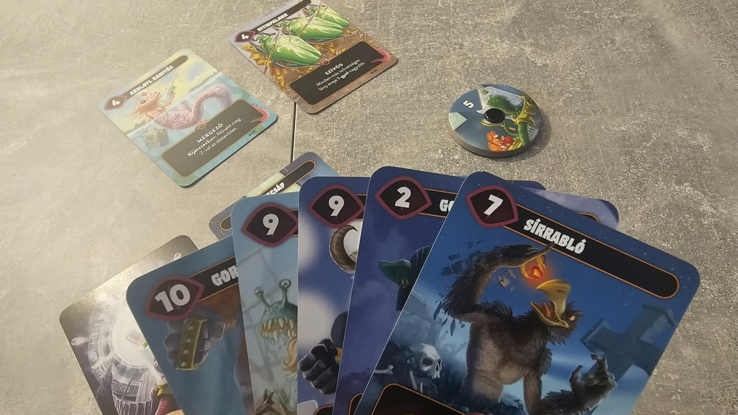 Az Első találkozás hangulata ráadásul pont attól működik, hogy nem próbál túlírt világépítést adni a lapok köré. Elég, hogy a játék furcsa hibrid szörnyeket dob eléd, mert a lényeg nem az, hogy ezek milyen lore-ból jöttek, hanem hogy mikor mered kijátszani őket. A Mindbug legjobb pillanatai ugyanis mindig abból születnek, amikor a saját lapodtól kezdesz félni. Ez az a kis gonosz húzás, amitől a játék sokkal több lesz egyszerű kétfős kártyacsatánál. Az Első találkozás emiatt annak a legjobb, aki egy feszes, tiszta, nagyon jól újrajátszható párbajjátékot keres, amiben nincsen sallang, csak ideg, blöff és tempóérzék. És igen, pont emiatt az is benne van, hogy a 48 lapos alapkészlet egy idő után ismerőssé válik, de első belépőpontnak ez inkább előny, mint hiba, mert megtanítja, hogyan kell gondolkodni a Mindbug logikájával.