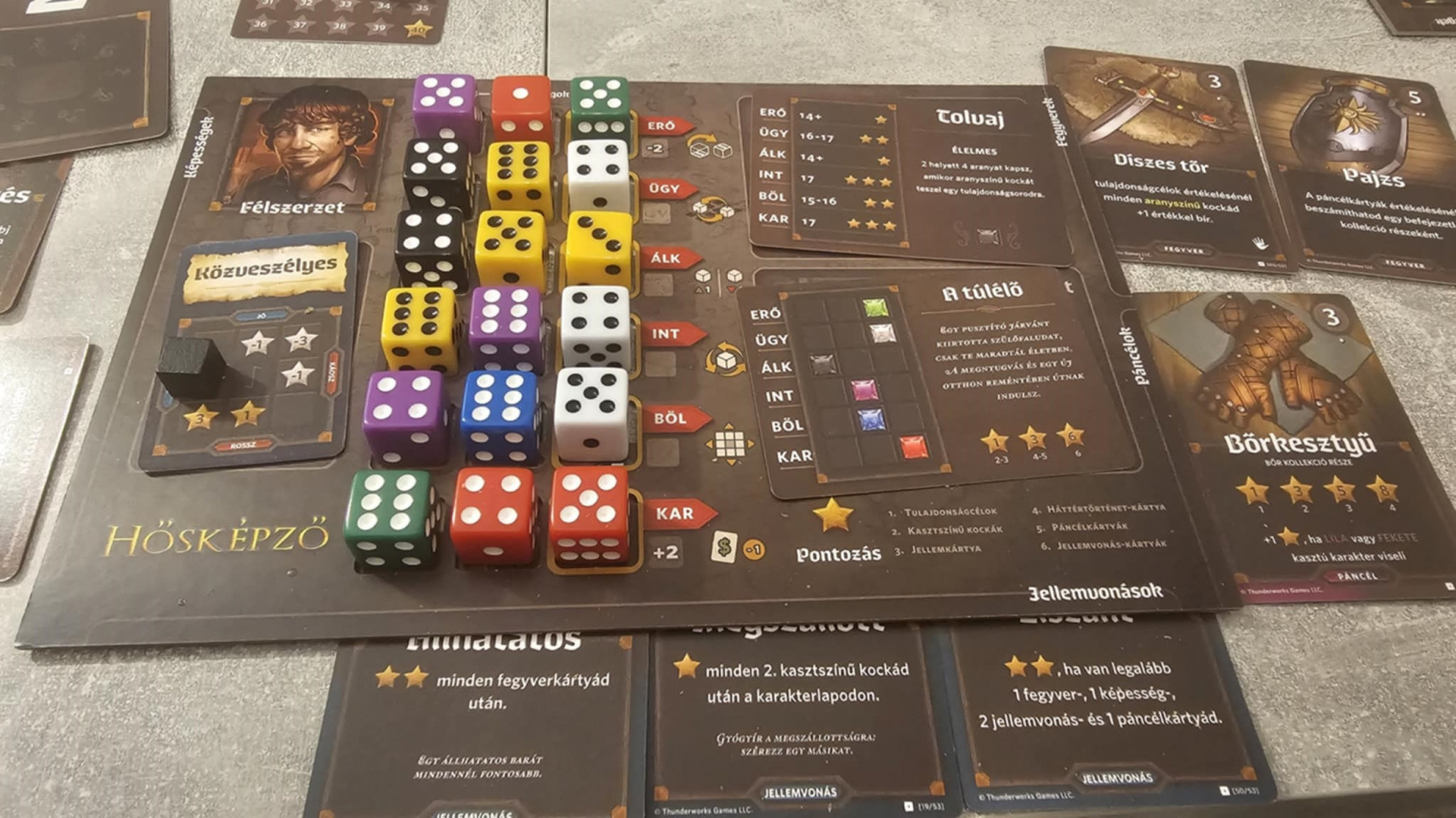 Tematikusan a Hősképző meglepően erős. Bár alapvetően egy absztrakt, pontoptimalizálós eurogame-ről van szó, a karakterépítés folyamata mégis kézzelfogható és szórakoztató. A végére valóban úgy érzed, hogy létrehoztál egy hőst, akinek van személyisége, stílusa és története, még akkor is, ha ez a történet csak a kártyák és ikonok szintjén létezik. Ez a tematika különösen azoknak szól, akik ténylegesen eltöltöttek hosszú órákat egy RPG karakterlapja felett, és tudják, milyen fájdalmasan nehéz döntés például egyetlen pontot áttenni egyik tulajdonságból a másikba.