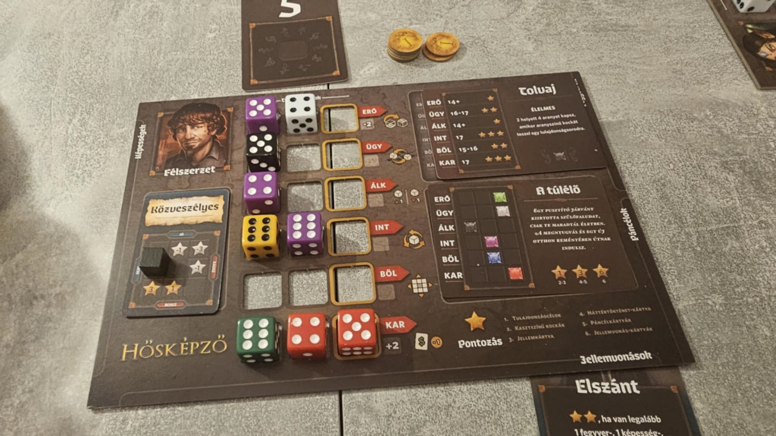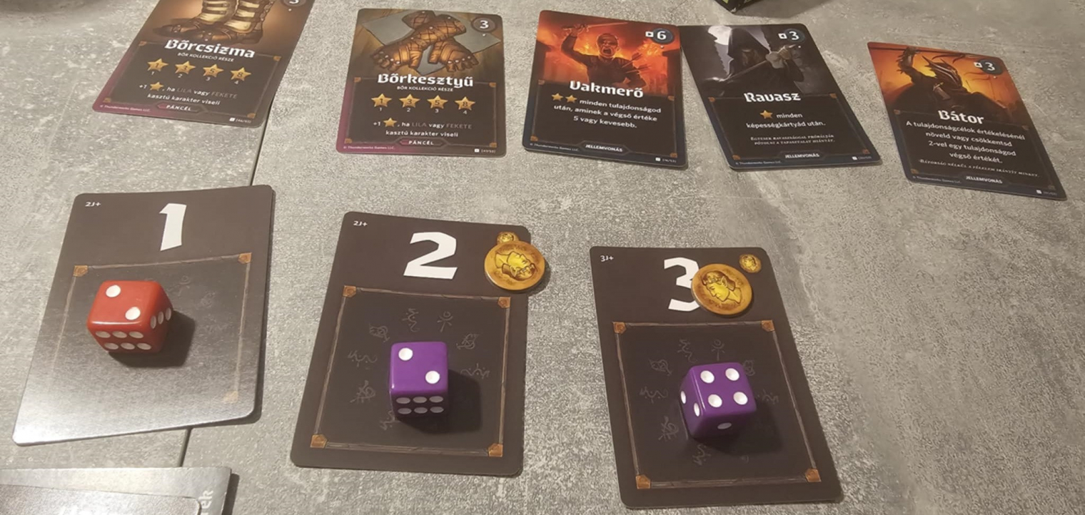 A Hősképző egyik legnagyobb erőssége az, ahogyan a látszólag egyszerű rendszer fokozatosan válik egyre összetettebbé. A tulajdonságok mellett ugyanis megjelennek a felszerelések, képességek, jellem- és háttérkártyák, amelyek mind-mind speciális szabályokat, bónuszokat és pontszerzési lehetőségeket adnak. Ezek a kártyák gyakran szorosan kapcsolódnak egymáshoz, így a játék nemcsak arról szól, hogy jó kockákat válassz, hanem arról is, hogy felismerd azokat a kombinációkat, amelyek hosszú távon működni fognak. A döntések súlya itt folyamatosan jelen van, és ritkán van egyértelműen jó vagy rossz lépés, inkább csak kevésbé fájdalmas kompromisszumok. A játék tempója kimondottan feszes. Nincs üresjárat, minden körben történik valami, és folyamatosan figyelned kell a többiek döntéseit is. A kockákért folyó verseny kifejezetten interaktívvá teszi a Hősképzőt, még akkor is, ha közvetlen konfrontáció nincs benne. Egy-egy elvitt kocka, egy időben megszerzett kártya könnyen keresztülhúzhatja mások számításait, ami állandó feszültséget tart fenn az asztal körül. Ez az interakció sosem válik rosszindulatúvá, inkább egy csendes, taktikus adok-kapokként működik.