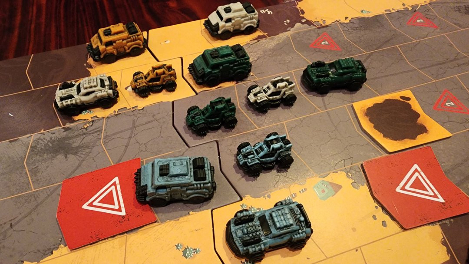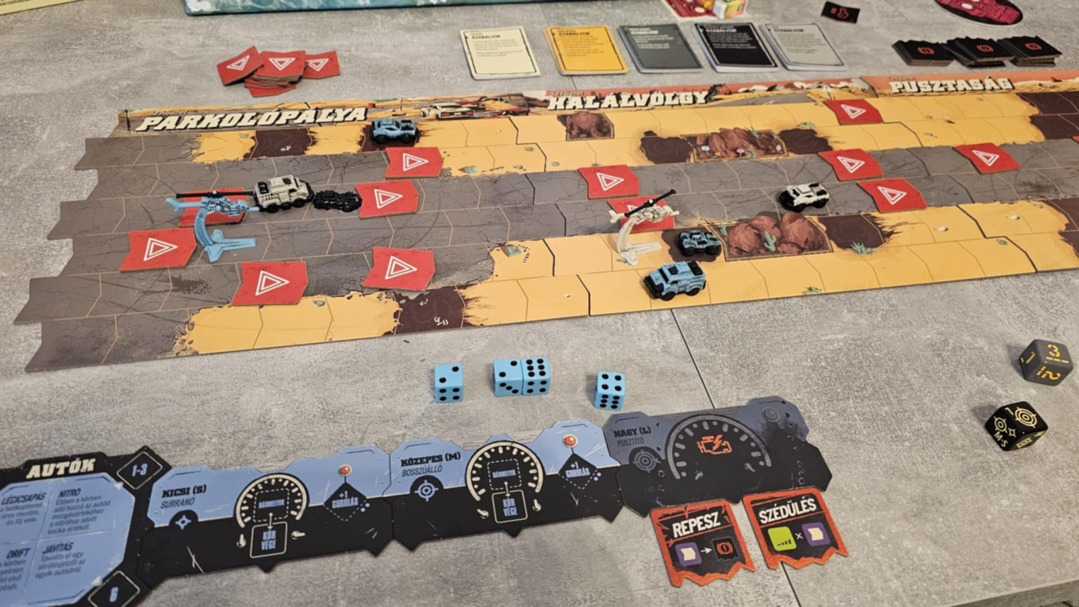 A játéktábla maga olyan, mint egy hosszúra nyúlt, végtelenített országút, amely szakaszról szakaszra gördül előre. A mezők jelenléte nem csupán vizuális eszköz: minden egyes szektor egy új taktikai kérdés arra, hogy hol van a legjobb helyed, hol tudsz kilökni másokat, vagy hogyan tudod elkerülni a rád váró rombolást. A döntés pedig sosem egyszerű, mert a gyors tempó miatt ritkán látsz messzire előre. A játékosok folyamatos mozgása miatt pedig valóságos verseny alakul ki azért, hogy ki kerül a pálya élére, hiszen aki lemarad, azt könyörtelenül lenyeli a játék rendszere, mivel amint a táblát előrébb tolják, vagyis megjelenik egy újabb útrészlet, a leghátsó szakasz eltűnik - és vele együtt minden még ott veszteglő kocsi is. Ez a folyamatos, sodró előrehaladás különösen izgalmassá teszi a versengést, mert a túlélés és a pozícióharc kéz a kézben járnak, miközben a káosz mindent körülölel.