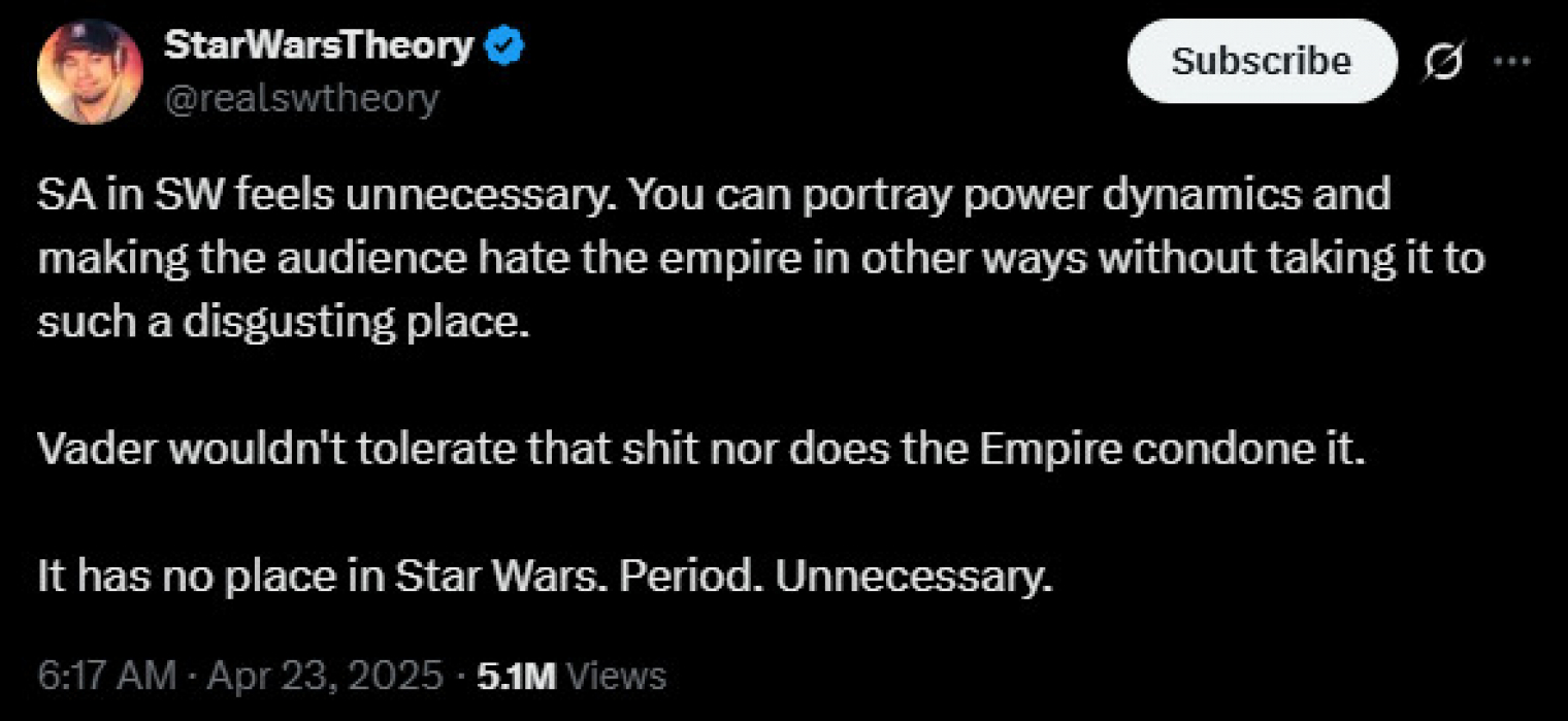 Mindennek kapcsán viszont a legfélelmetesebb eleme ezeknek a rendszereknek az, hogy az a nézőpont, amire a korábban megfogalmazott gondolat vágyik, valójában nem létezik. Az Andor tökéletesen szemléltette az egyetlen olyan birodalmi nézőpontot, mely mind realisztikusan nézve, mint Lucas szemléletmódja szerint létezhet. Egész pontosan Syril és Dedra történetéről van szó.