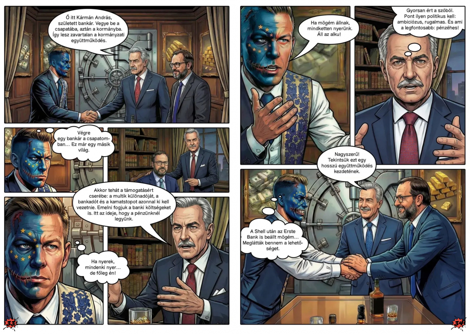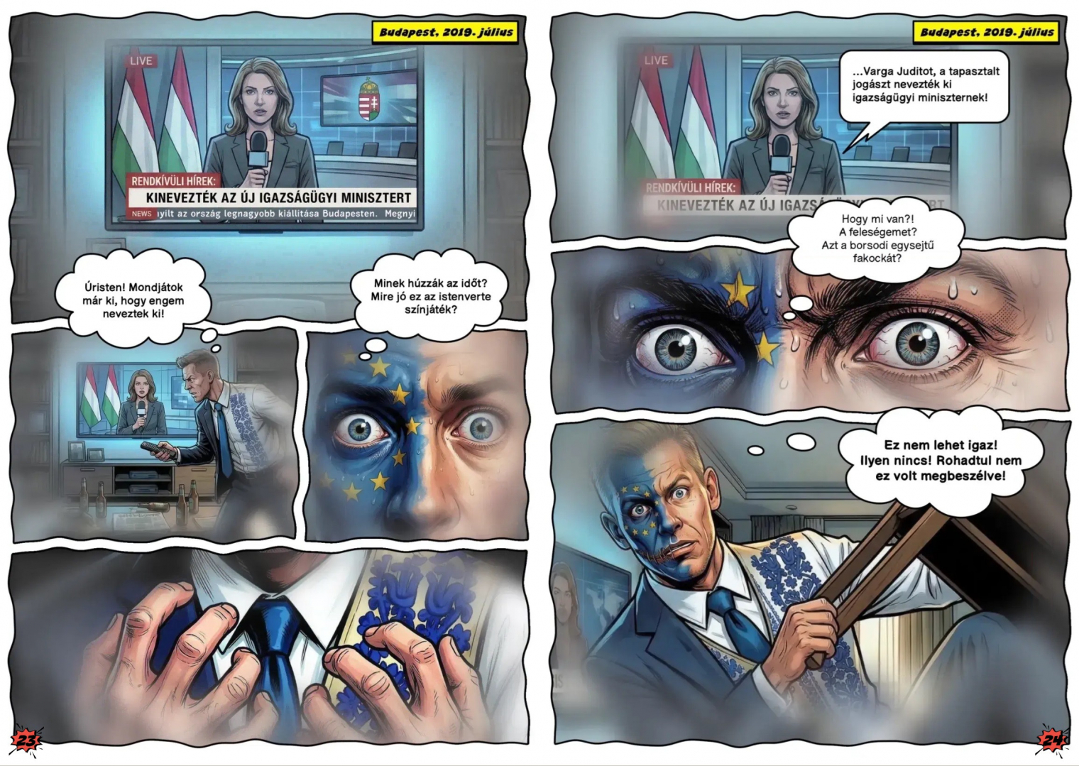 Ezzel önmagában nem mondtam újat, politikai karikatúra, pamflet, gúnyrajz, agitprop mindig is létezett, és a képregény történetében is van hagyománya annak, hogy a rajzolt narratíva propaganda- vagy ellenpropaganda-eszközzé válik - politikai/közéleti témák kapcsán a comicstrip műfajban elég csak a Napirajzra, vagy Marabu munkáira gondolni. A gond az, hogy itt a forma és a tartalom viszonya látványosan félrecsúszik. A képregény akkor működik igazán, amikor a panelek közti "üres hely" (az, amit az olvasó fejben tölt ki) dolgozik, amikor a ritmus, a beállítás, a vizuális poén, a dramaturgiai csavar adja az élményt. Egy politikai üzenet akkor működik, amikor egyszerű, ismételhető és nem igényel sok értelmezést. A kettő persze találkozhat, csak ehhez alkotói bátorság kellene, valódi karakterek, valódi konfliktusok, olyan jelenetek, amelyek nem csak felmondják a tételt, hanem megmutatják, miért érdekes, miért igaz, miért vitatható valami. A nyilvános kommunikációból viszont inkább az látszik, hogy ez a projekt már a startvonalon eldönti a végkövetkeztetést, és a "történetek" feladata ennek alátámasztása, nem pedig egy önállóan is működő narratíva felépítése.