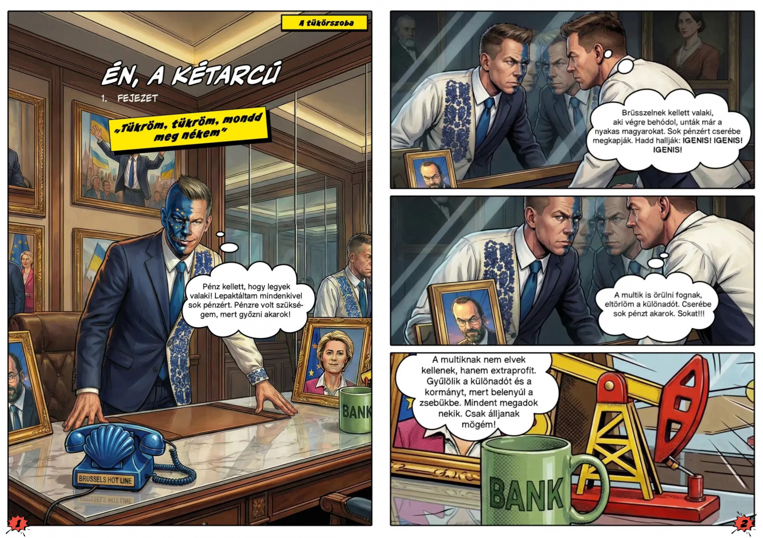A magyar képregényes közegnek vannak örök visszatérő vitái. Kell-e több szuperhős, vagy pont hogy kevesebb, lehet-e nálunk mainstreamet építeni, van-e értelme "komolyan venni" egy médiumot, amit a közbeszéd még mindig hajlamos gyerekszobába száműzni. Ehhez képest az, hogy 2026-ban egy politikai célú kiadvány képregényformában kerül a könyvesboltok és a feedek közelébe, papíron akár még jó hír is lehetne. A formátum legalább bekerül a látómezőbe sokak számára, olyanok is felfigyelhetnek a műfajra, akik egyébként a kezükbe nem vennének egy képregényfüzetet. Csakhogy az Én, a kétarcú nem azért választja a képregényt, mint formátumot, mert valóban hisz benne, hanem mert ez gyors, könnyen terjeszthető, plakát-kompatibilis és azonnal érthető vizuális ütést ígér. Nem mellékesen az AI segítségével költséghatékonyan és villámgyorsan előállítható - mert egy pillanatig se gondoljátok azt, hogy ez a kiadvány nem egy promptokkal gyártott AI slop. A Nemzeti Ellenállás Mozgalom (NEM) kifejezett célja a kiadvánnyal a saját kommunikációja alapján az, hogy történeteken keresztül "leleplezze" Magyar Péter "kétarcúságát", vagyis politikai támadóanyagként pozicionálja a projektet.